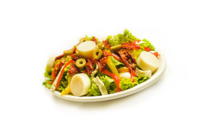Preparada com palmitos selecionados, tomate seco, queijo minas, alface especial, pimentão em conserva, rúcula, ovos de codorna e azeitona sem caroço.